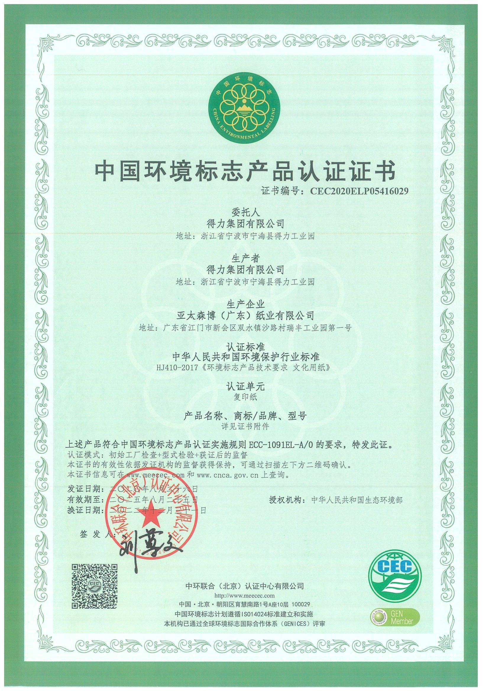中國環(huán)境標志產(chǎn)品認證證書有效期  :   2025年8月25日